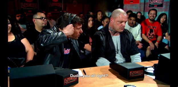Vampiro stands up and while the crowd is going wild, chanting “Vampiro” and “Lucha! Lucha!” the usual steady presence for the audience at home from the commentary desk is silent. Obviously, Vampiro is not in a position to provide commentary, but Matt Striker is completely silent.