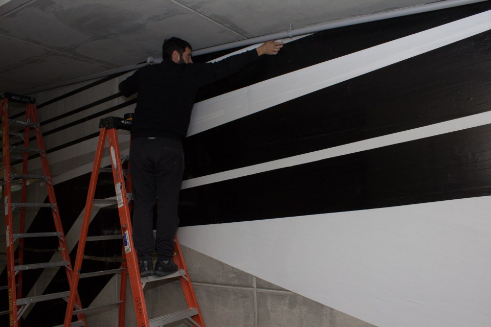 ← Previous Next → Though Simek usually works with paint, the temporary exhibit of his work in the Watson Institute was produced with colored duct tape.